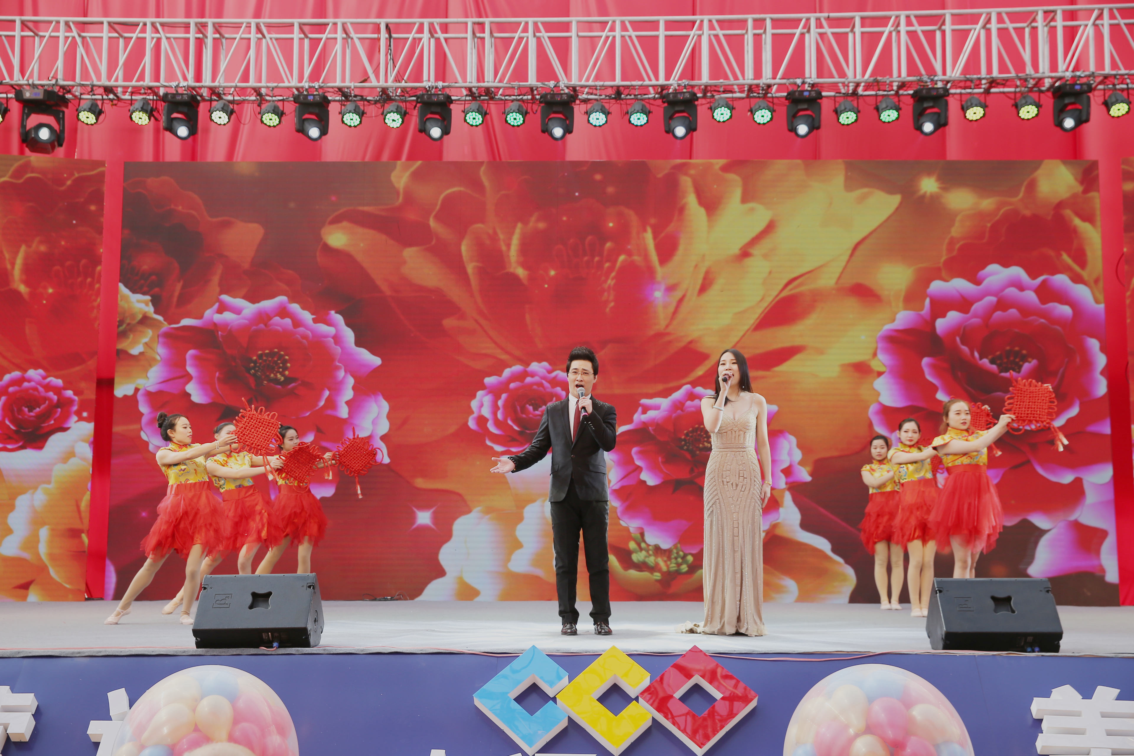 盛典现场,灯光璀璨,花团锦簇,喜气祥和。
