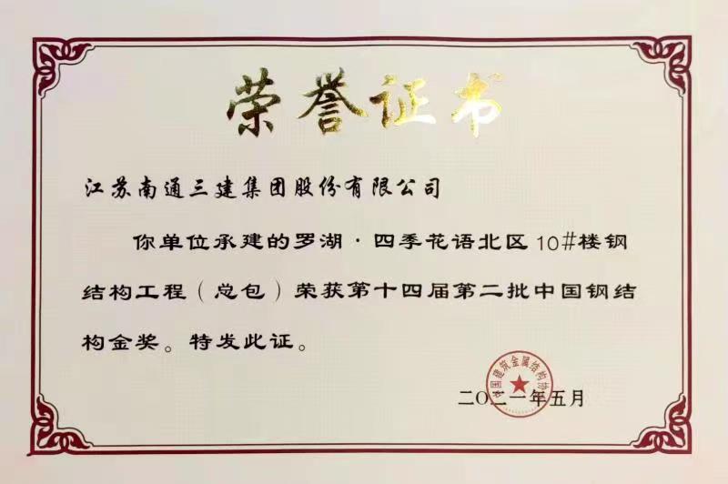 5月29日,2021年全国建筑钢结构行业大会在湖北·武汉召开,会议表彰了“第十四届(2019~2020年度)第二批中国钢结构金奖”获奖单位。江苏乐鱼游戏官网登录集团股份有限公司承建的罗湖·四季花语北区10#楼钢结构工程、米其林沈阳轮胎扩建项目,荣获了“中国钢结构金奖”。这是乐鱼游戏官网登录首次在钢结构专业国家级奖项中获此殊荣,填补了承建装配式钢结构住宅工程的一项空白,实现了“从无到有”的突破。