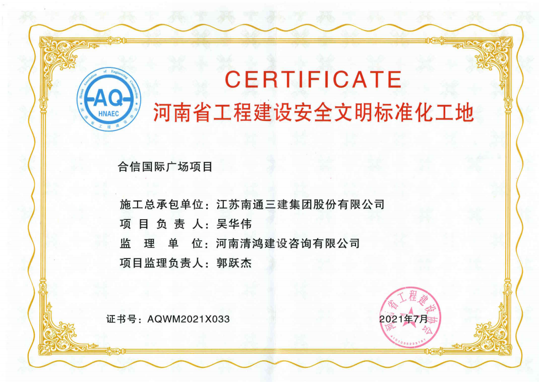 “工程建设安全文明标准化工地”是河南省工程建设协会评选的工程建设安全文明标准化建设方面荣誉奖项,代表着获奖工程现场标准化、精细化、信息化建设程度高、扬尘治理符合河南省相关要求,并得到了河南省建设相关部门、专家的高度肯定。