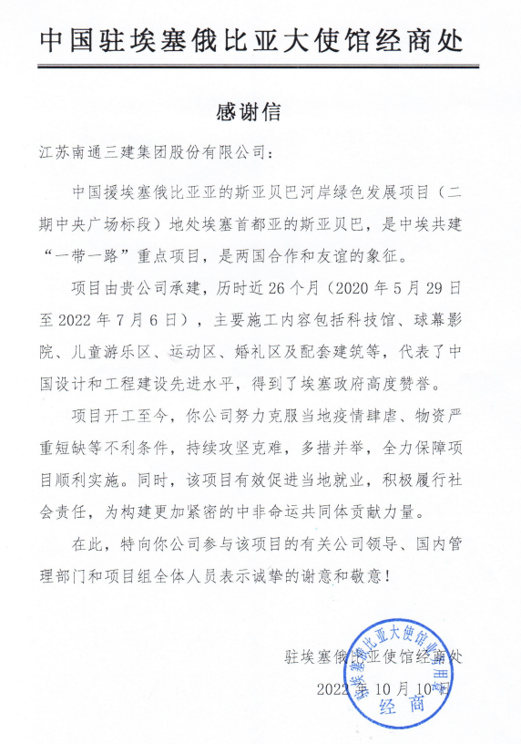 该项目自2020年5月29日开工以来,乐鱼游戏官网登录管理团队在挑战面前保持定力,以高度的责任感和凝聚力带领项目走出了新冠疫情、埃塞内乱等不可抗力的泥潭,高质量兑现了履约承诺,项目获得埃塞各方的高度评价,现已经成为该国接待重要外宾的打卡地。中国驻埃塞俄比亚大使馆经商处也向乐鱼游戏官网登录发来了感谢信,高度肯定了工程质量,感谢公司的付出。