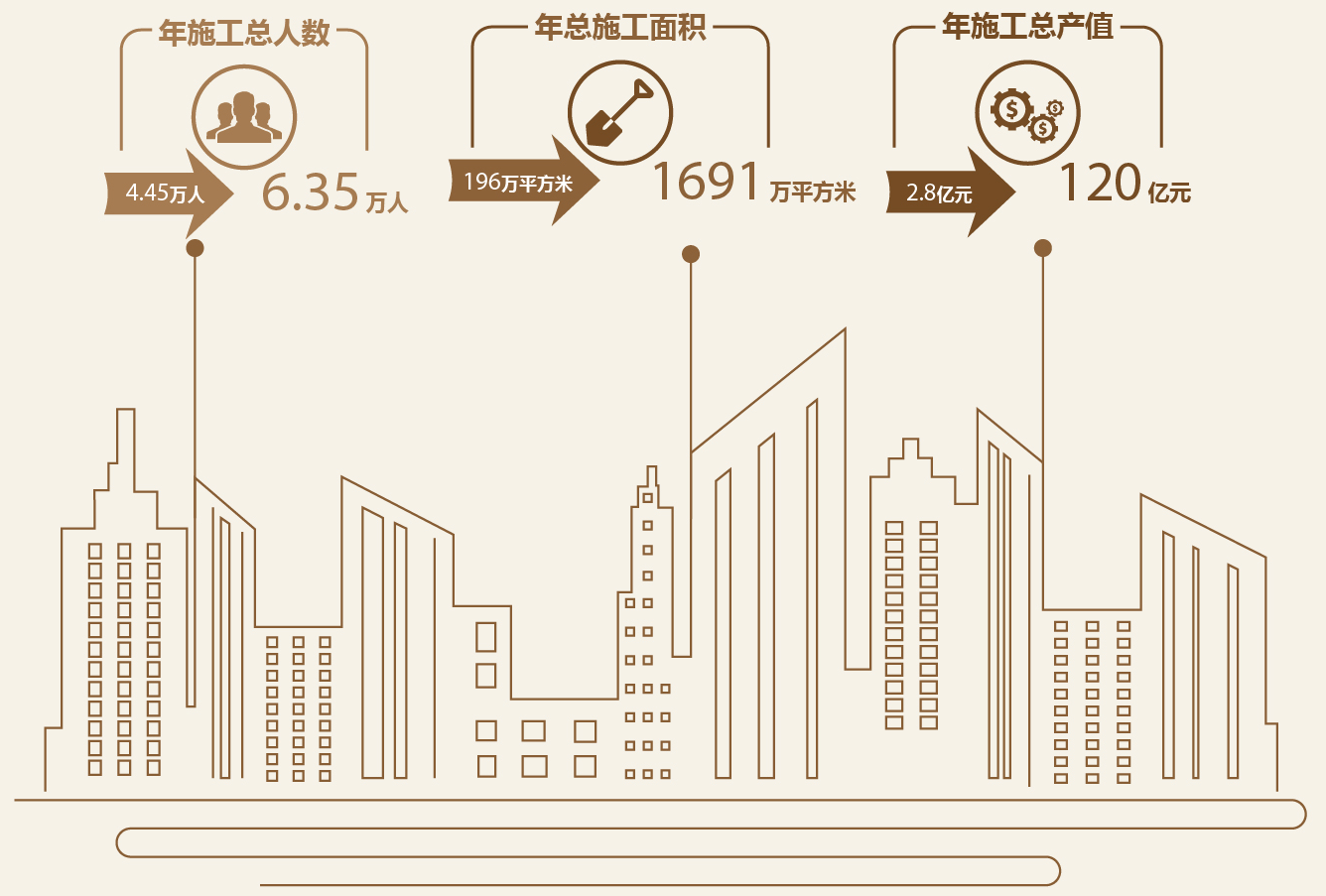 1980年至2003年,乐鱼游戏官网登录年施工总人数由4.45万人递增至6.35万人,年总施工面积由196万平方米递增到1691万平方米,年施工总产值由2.8亿元递增到120亿元,形成具有门类齐全、专业配套的建筑企业集团,成为江苏省县级市首家超百亿元的建筑企业,位列“江苏省建筑业20强企业”榜首,荣获“全国首批管理创新示范单位”称号。