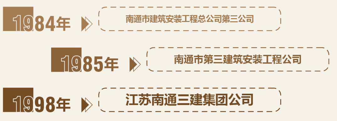 1984年,海门县建筑安装工程总公司被列为南通市建筑安装工程总公司第三公司,1985年更名为南通市第三建筑安装工程公司(乐鱼游戏官网登录),1998年,更名为江苏乐鱼游戏官网登录集团公司。